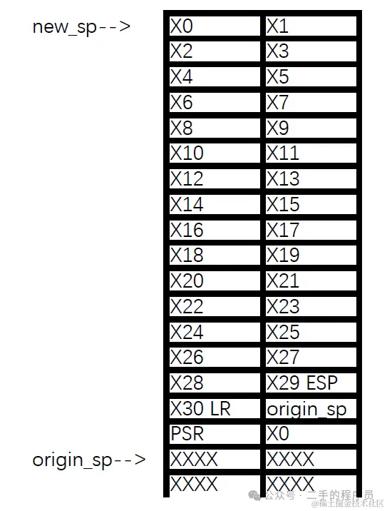 我们在这里需要先保存所有寄存器的值,保存了寄存器的值之后,就可以使用这些寄存器了,保存结构如下: