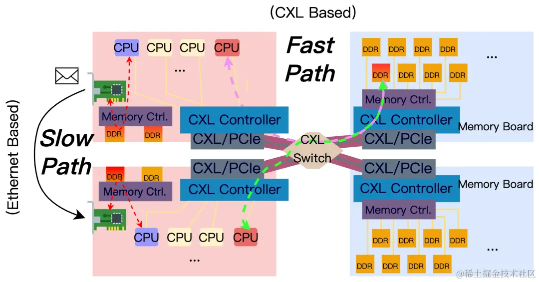 (1)在跨主机通信中,Yggdrasil采用基于CXL的分布式共享内存(即快速通信路径)以提升性能,在CXL不可用的情况下,自动无感切换回传统socket(即慢速通信路径)。