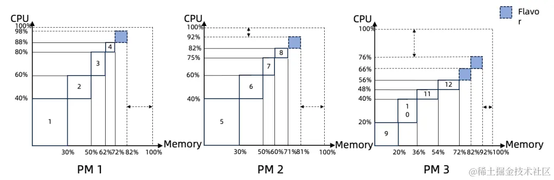 在云计算场景下,由于数据中心负载水平的波动性和需求的不确定性,各个物理服务器普遍存在资源碎片问题,造成数据中心资源浪费。如图1所示,客户需要紧急开通6台指定规格的云服务器,但集群内剩余资源只能满足4台云服务器,形成典型的资源碎片现象。如何应对资源扩容中常见的周期长、成本高等挑战,满足极端场景下的客户需求,成为亟需解决的难题。