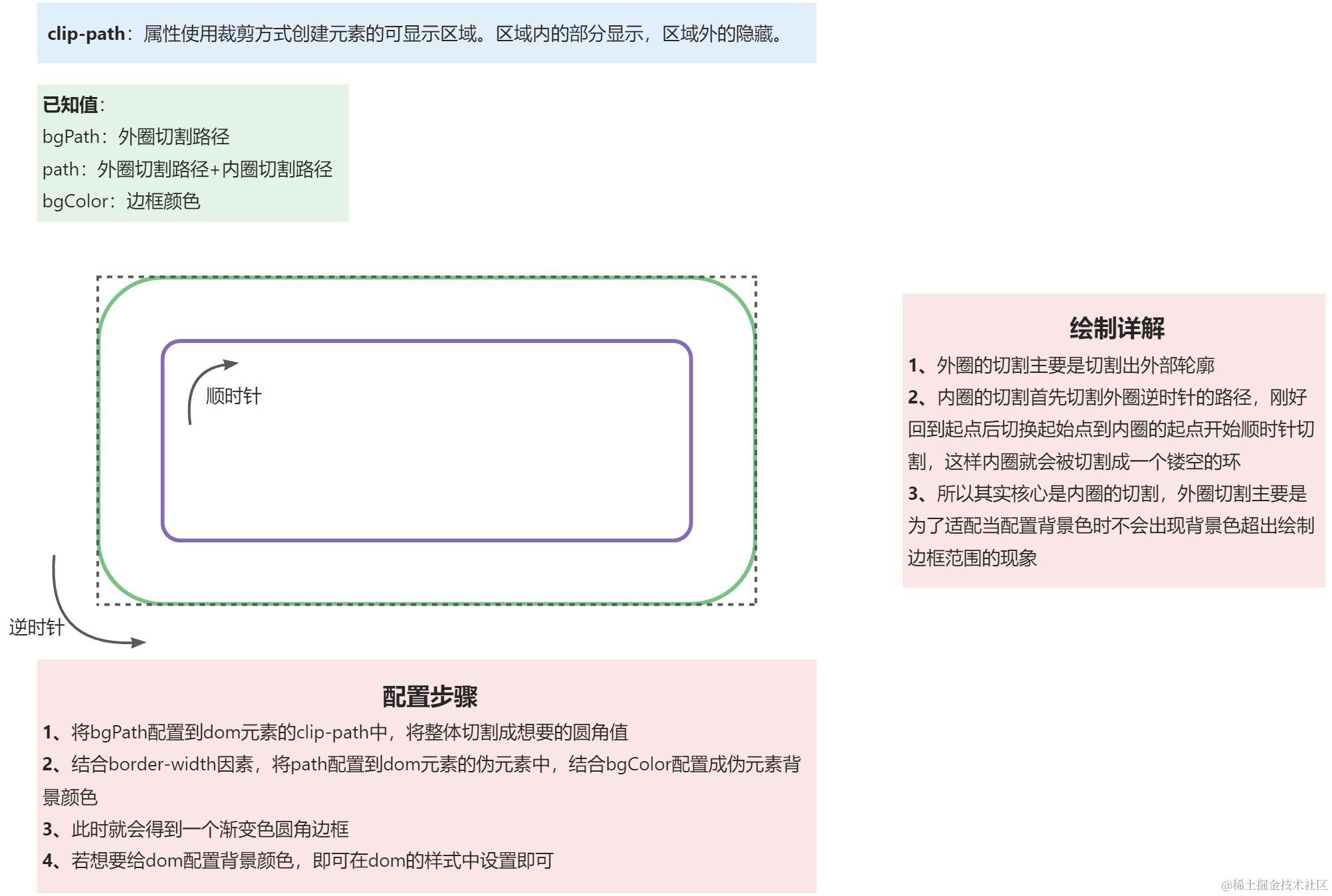 通过CSS样式中的clip-path样式,结合dom元素的after进行叠加遮盖,实现 渐变色 圆角/倒角 边框 的效果