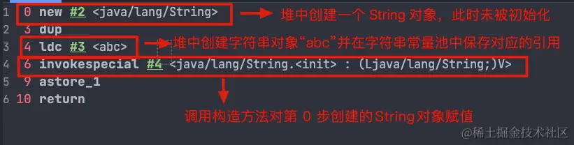 这里就不对上面的字节码进行详细注释了,7 这个位置的 ldc 命令不会在堆中创建新的字符串对象“abc”,这是因为 0 这个位置已经执行了一次 ldc 命令,已经在堆中创建过一次字符串对象“abc”了。7 这个位置执行 ldc 命令会直接返回字符串常量池中字符串对象“abc”对应的引用。