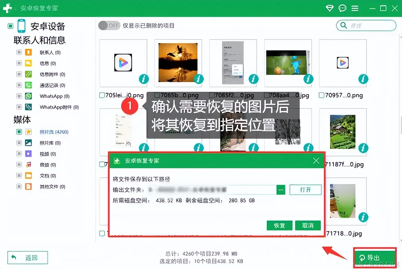 第三步:在图片目录中,查看有哪些是需要恢复的照片,选择一个安全的位置保存恢复的照片,避免保存在空间不足的磁盘中,以防被覆盖。