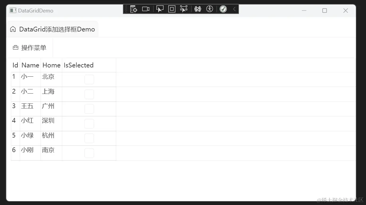 <TextBlock Text="DataGrid添加选择框Demo" />