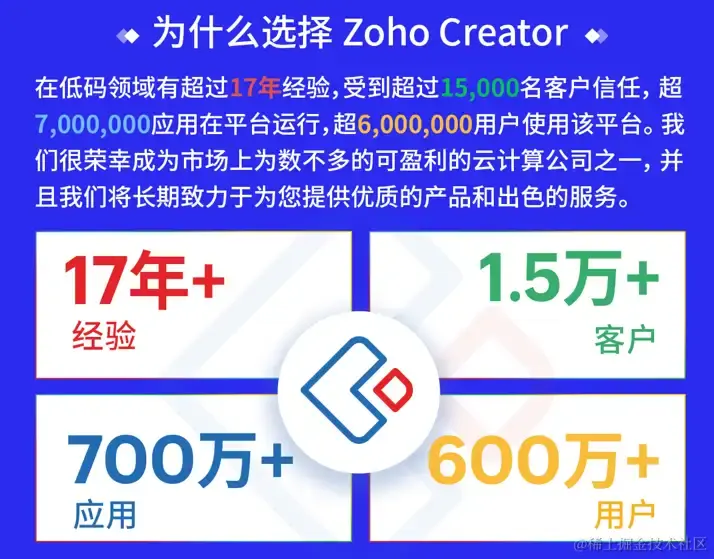 Zoho Creator是一个云端低代码开发平台,它将应用程序开发、商业智能和分析、智能集成和流程自动化的强大功能整合到一个平台中。在低码领域有超过17年经验,深受1.5万名客户的信赖,构建超700万个应用程序,在全球范围内拥有600多万用户,并保持着稳定增长的态势。
