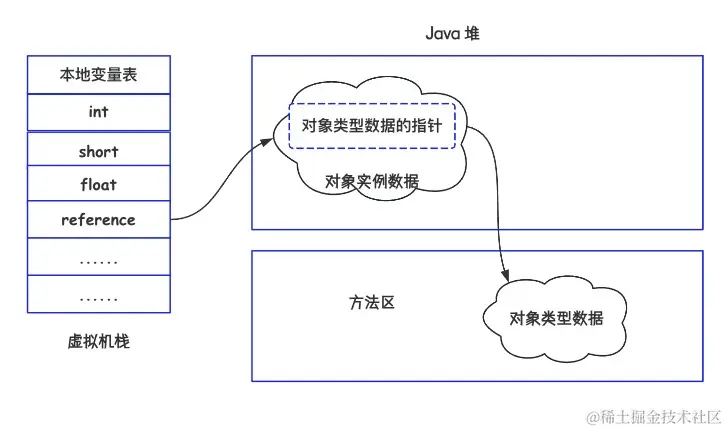 使用指针的方式时,Java堆中会存放访问类元数据的地址,reference中存储的就是直接是对象的地址,如下图所示: