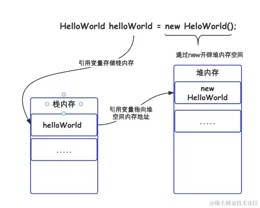 在上面的代码片段中我们通过new创建HelloWorld对象时,该对象实例会被保存到堆中,当我们需要引用堆里面的HelloWorld实例时,可以在栈中定义一个特殊的变量,让栈中的变量的取值等于HelloWorld对象在内存中的首地址(在示例代码中该特殊变量就是helloWorld),栈中的helloWorld变量就变成了HelloWorld实例的引用变量,以后就可以在程序中使用栈中的引用变量来访问堆中的HelloWorld对象实例。如图: