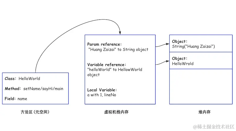 通过上图所示,在示例代码段中,方法区主要存储的中的是HelloWorld的类信息、以及HelloWorld类下的setName、sayHi、main方法的定义以及name字段信息。