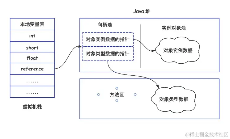 使用句柄这种方式时,Java堆中会划分出一块内存来做为句柄池,reference中存储句柄的地址,句柄中存储对象的实例数据和类元数据的地址,如下图所示: