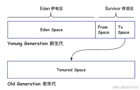 通过上图可以看到目前Java堆的分代,分成老年代和新生代两大部分,当新创建一个对象时会放入新生代的Eden区,在Eden区后面有分别有From和To两个内存区,统称为存活区(Survivor),这一块区域主要是来存放Eden区存活下来的对象,当新生代的对象经过多次回收之后依然存活或者虚拟机判断的对象(比如大对象)则会进入老年代。
