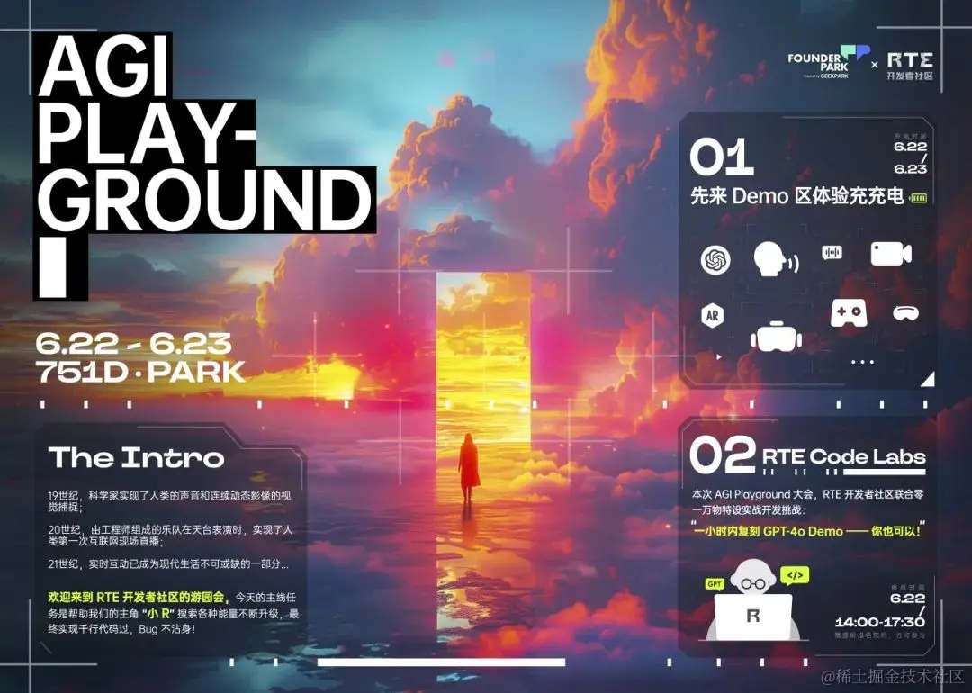 这一次我们作为 Founder Park 的合作方,在 AGI Playground 活动现场开辟了一片属于 RTE 开发者社区自己的大型实时互动展区。