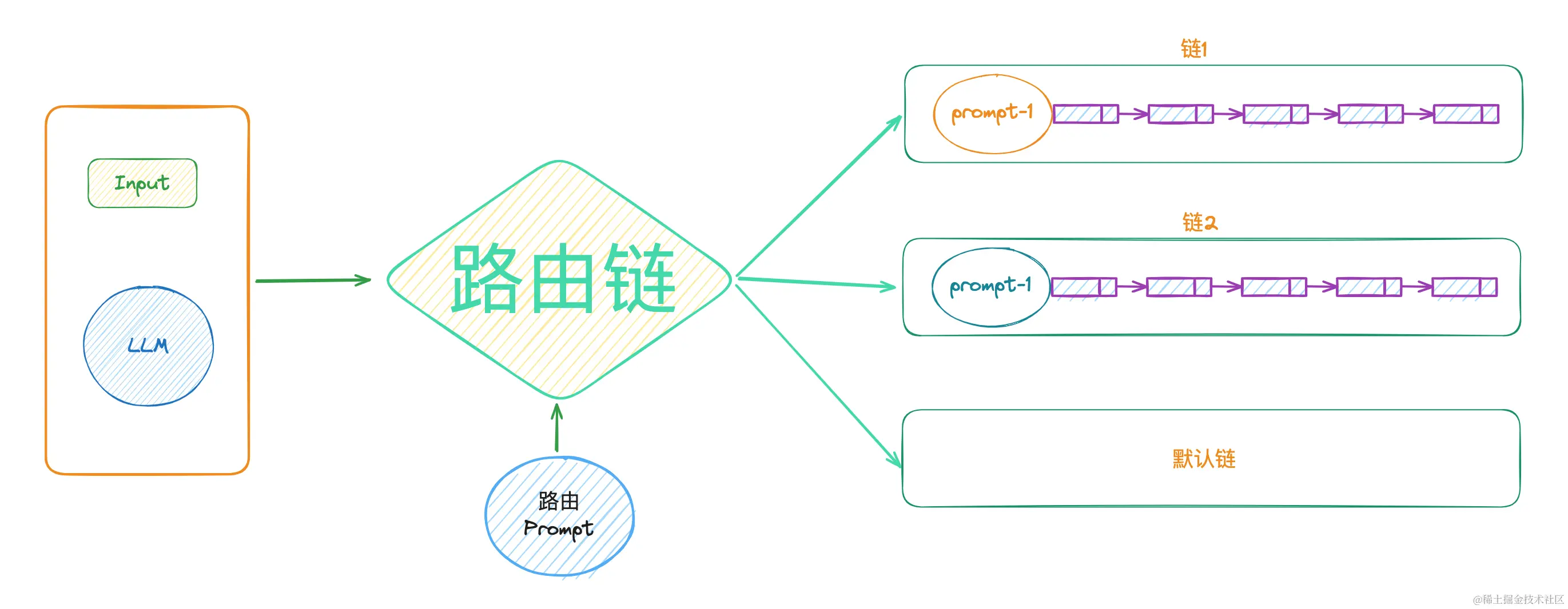 **路由链(RouterChain)**是由LLM根据输入的Prompt去选择具体的某个链。路由链中一般会存在多个Prompt,Prompt结合LLM决定下一步选择哪个链。