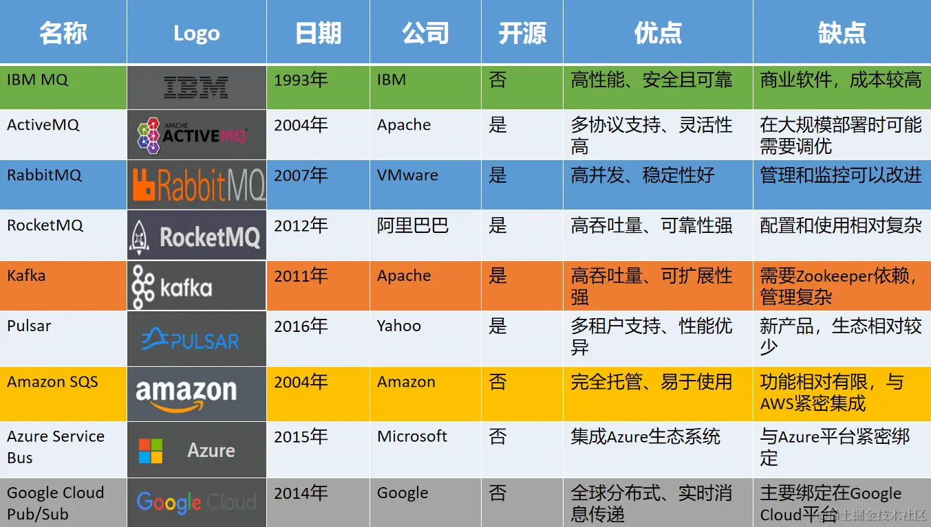 - RocketMQ:RocketMQ最初由阿里巴巴开发,是一个分布式消息中间件,以支持高吞吐量的消息传递而设计。它于2012年开源成为Apache软件基金会的一部分。