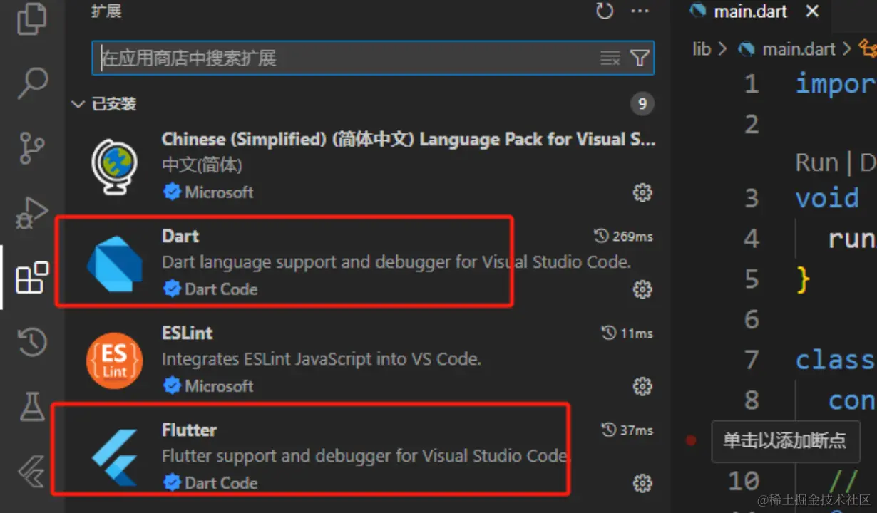 安装 Flutter 和 dart 插件,这样后续敲代码便有了一些快捷提示。
