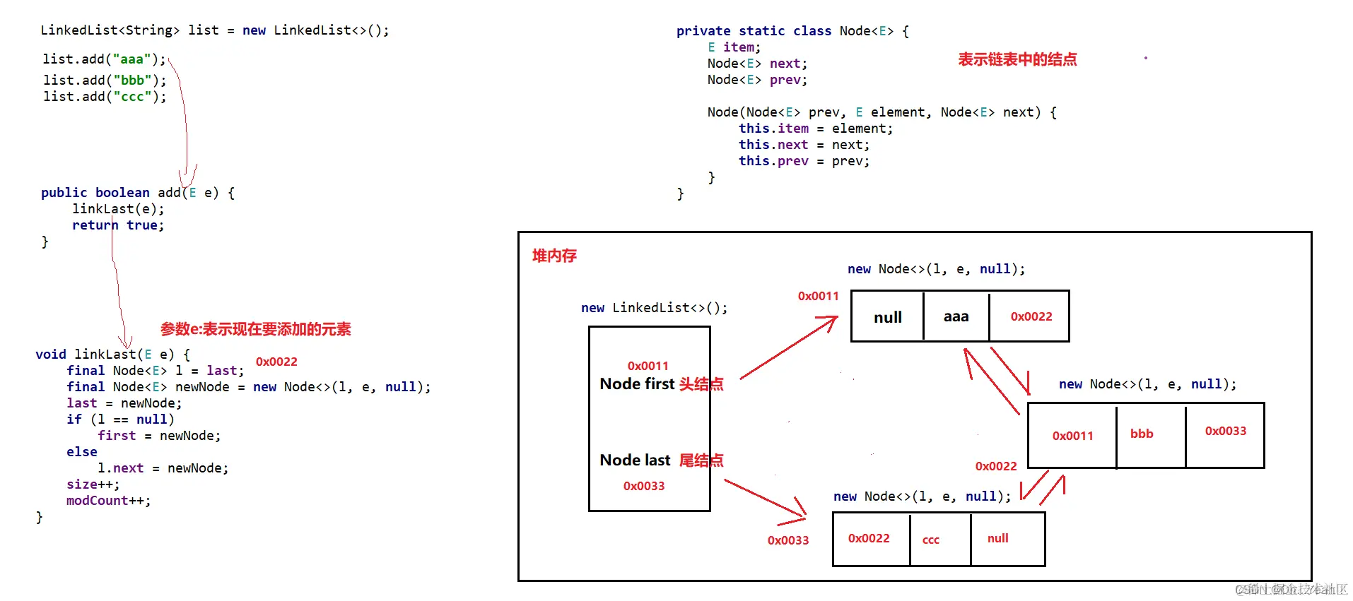 - 添加第二个元素时,底层创建一个结点对象,第一个结点会记录第二个结点的地址值,last会记录新结点的地址值