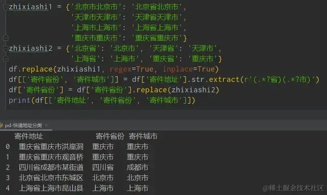 【瑜亮老师】:就3步,替换,提取,还原。这里的代码没有考虑其他情况。仅适用于图片中给出的数据情况。因为只是要展示替换的效果,这里直接对寄件地址做了修改,实际操作中不应该这样做,应该重新生成一个新列,并在新列上提取信息,最后删除该列。