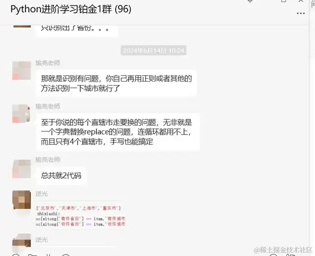 【瑜亮老师】:那就是识别有问题,你自己再用正则或者其他的方法识别一下城市就行了。至于你说的每个直辖市走要换的问题,无非就是一个字典替换replace的问题,连循环都用不上,而且只有4个直辖市,手写也能搞定。总共就2代码。