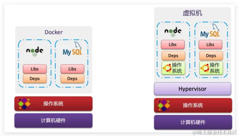 Docker仅仅是封装函数库,并没有模拟完整的操作系统,如图: