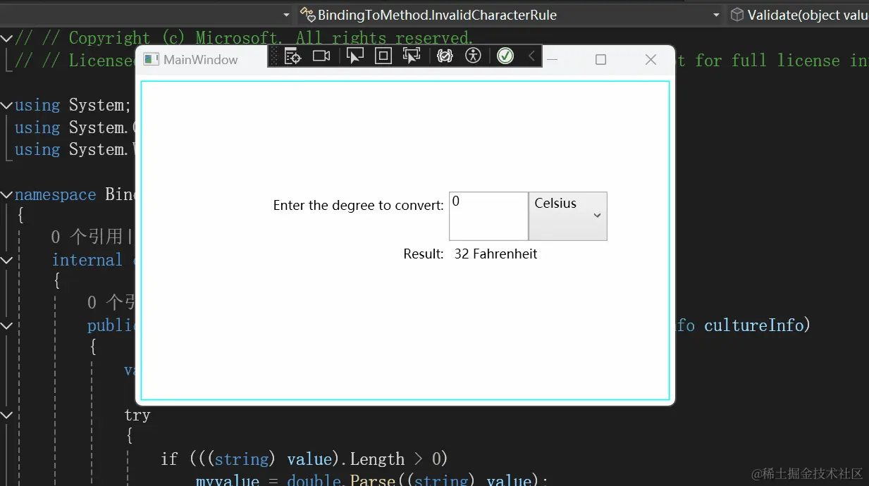 ComboBox的SelectedValue绑定到方法的第二个参数,刚开始也就是Celsius。