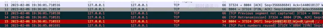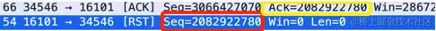 如果从抓包上来看表现就是(如下图)rst的报文中无ack标识,而且RST的seq等于它否定的报文的ack号(红色框的rst否定的黄色框的ack),当然还有另一种极小概率出现的特殊情况的表现我这里不贴出来了,它的表现形式就是RST的Ack号为1。