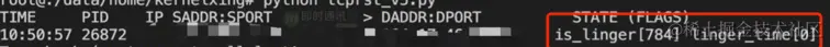 **计算:**socket的flag是784,第5位(从右往左)是1,这个是SO_LINGER位置位成功,但是同时linger_time为0。这个条件默认(符合预期)触发:上层用户退出时候,不走四次挥手,直接RST结束。