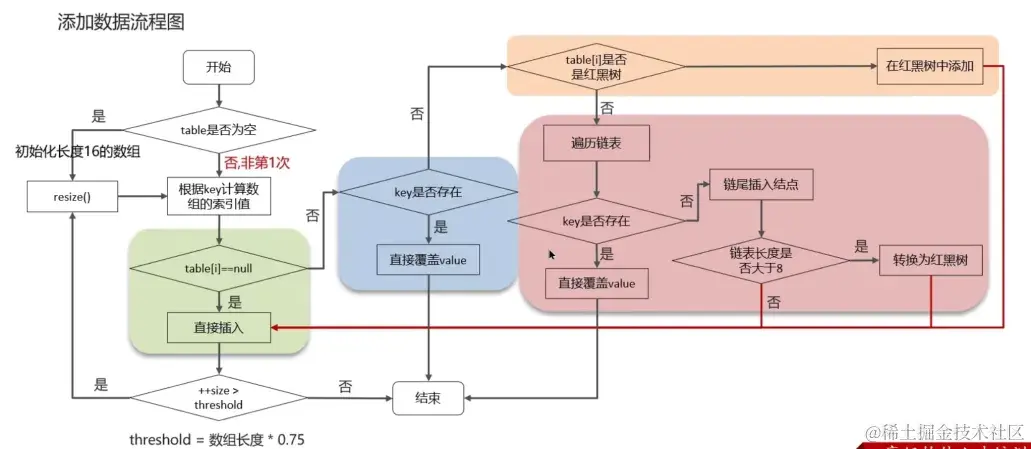 - 插入成功后,判断当前键值对数量是否超过了最大阈值 threshold(数组长度 * 0.75),如果超过,进行扩容。
