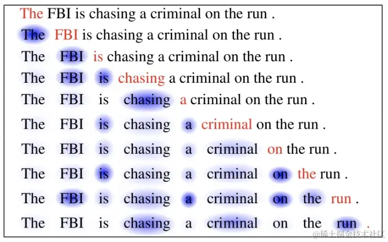 上图中,红色的词为模型当前正在识别的词,蓝色阴影的词表示此时模型更加关注的其他词,也就是说和红色的词更加有关联的词。