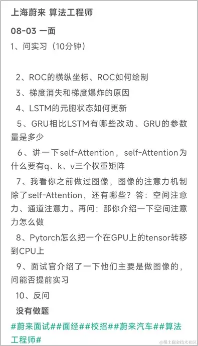 今天分享一个上海蔚来汽车的AI算法岗位面试经验总结帖,面试岗位为算法工程师。