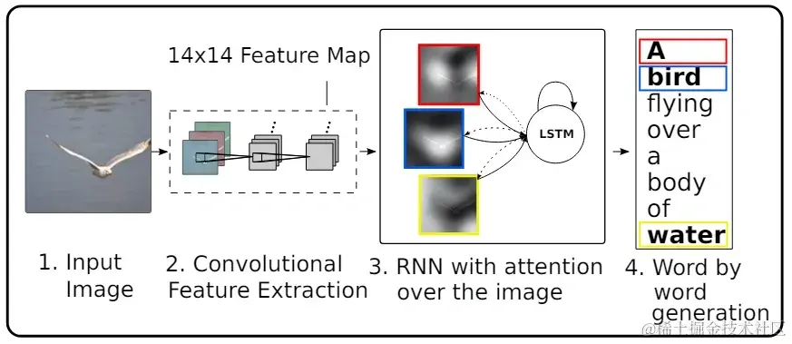 作者利用注意力机制来完成图像的信息捕捉。使用的仍然是典型的 Encoder-Decoder 架构。只不过因为输入数据是图像这种结构化的数据,因此,Encoder 采用的 CNN 来完成图像的特征提取,而 Decoder则采用了 LSTM 完成图像特征到描述文字的转换。