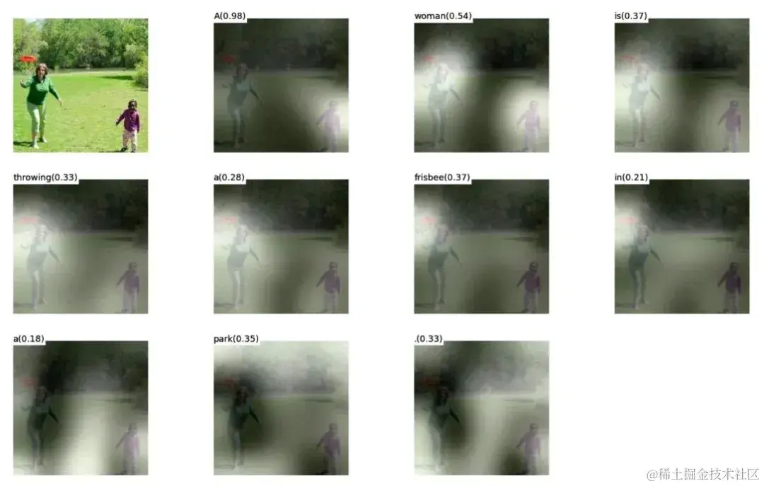 模型在看到上述的图像后,输出的描述为:A woman is throwing a frisbee in a park。可以看到,当输出 woman 的时候,模型更加关注图中的人物,而当输出 a frisbee(一个飞盘)时,模型更加关注图中的红色飞盘部分。