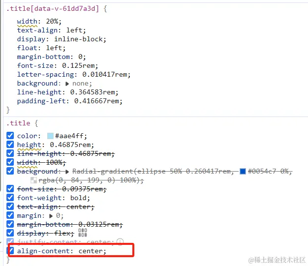 在审查元素时发现,自己写的title样式,全局还有相同的类名,而这里面有个align-content属性