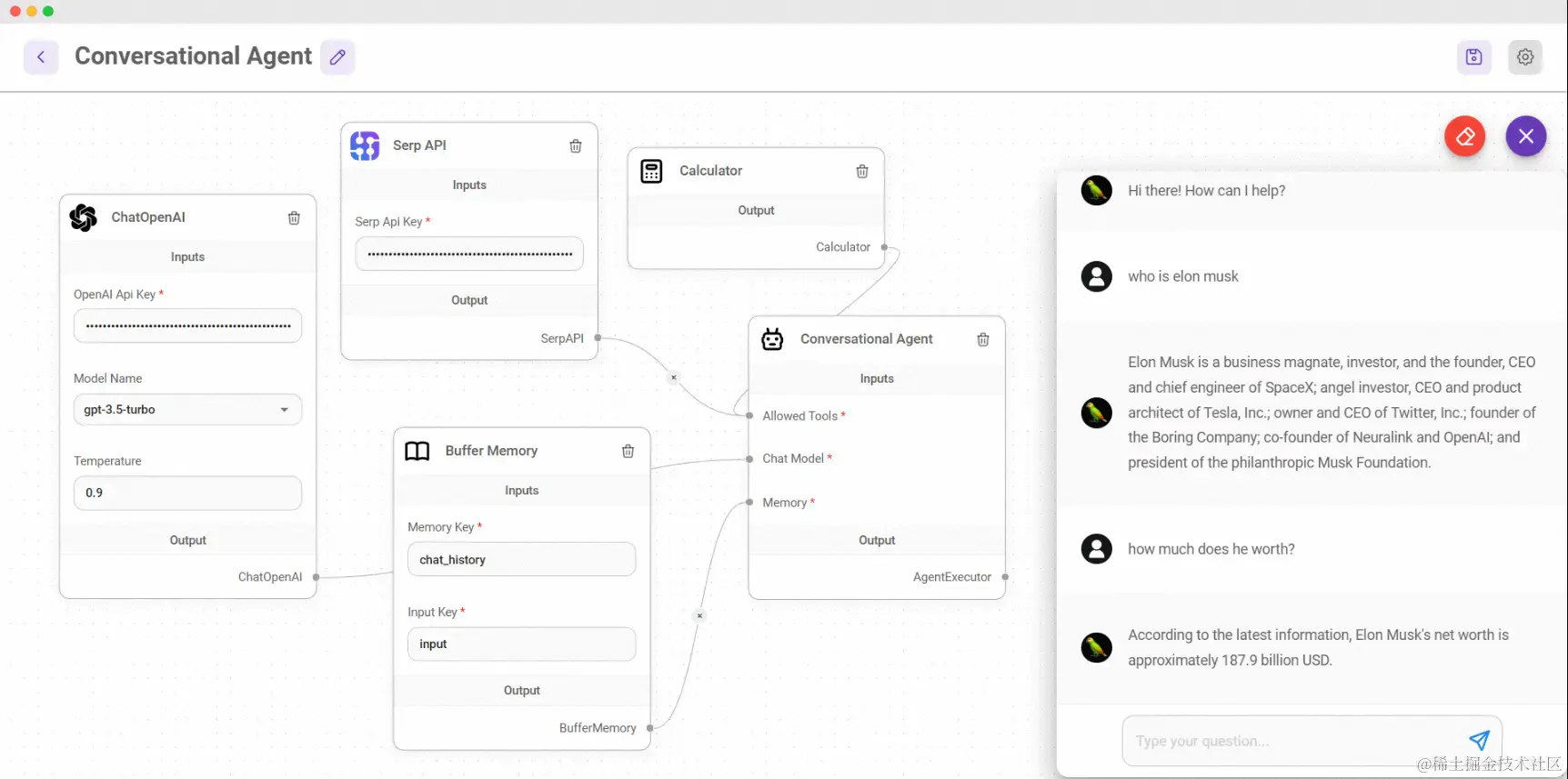 - 有记忆的会话代理:聊天模型的会话代理,它利用聊天特定提示和缓冲存储器