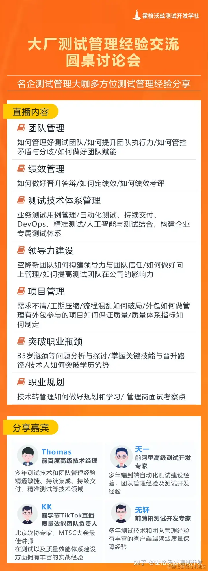 圆桌会主题直击测试管理工作的要点难点。与名企测试管理大咖们在线沟通,自由交流,思维碰撞。