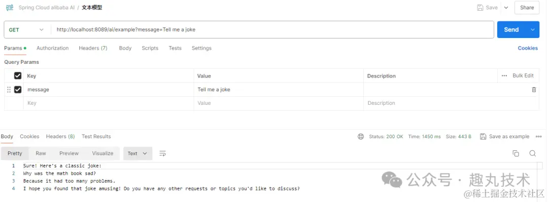 调用文本模型接口,可以看到AI生成了一个笑话。