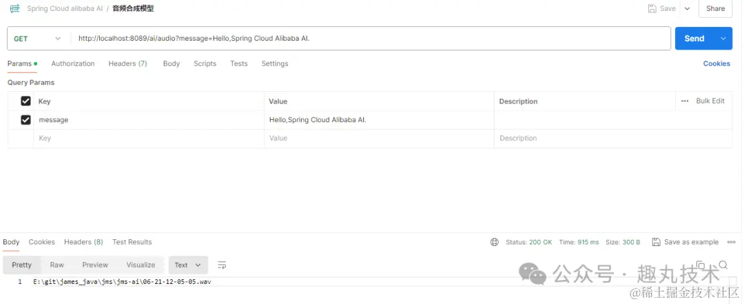 public String genAudio(@RequestParam(value = "message", defaultValue = "Hello,Spring Cloud Alibaba AI.") String message) {