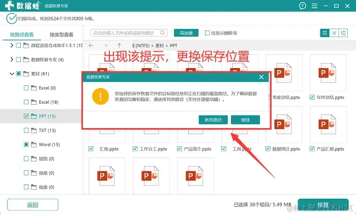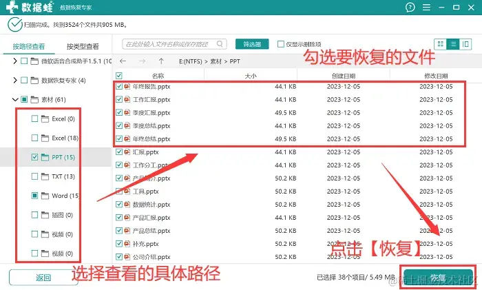 第3步:将需要恢复的文件都勾选完成后,点击【恢复】,选择将恢复后的文件保存在电脑的磁盘上。