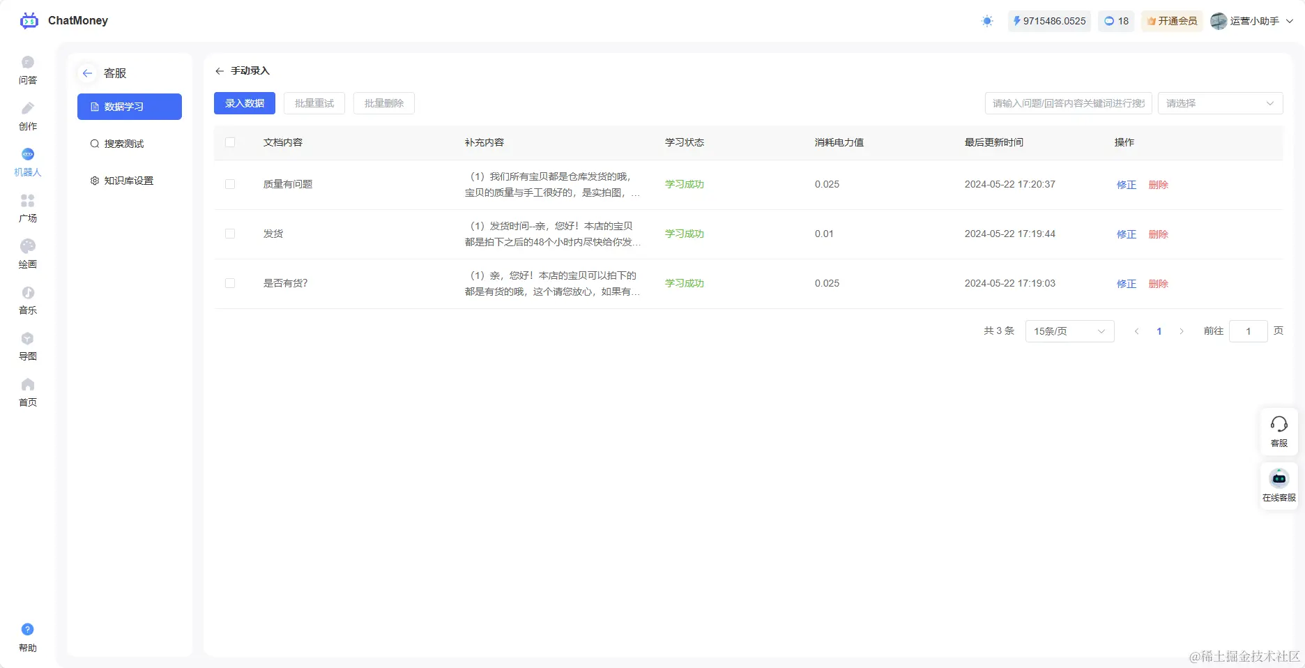 提供数据学习,可录入常见问题或AI客服所需要额外学习的知识