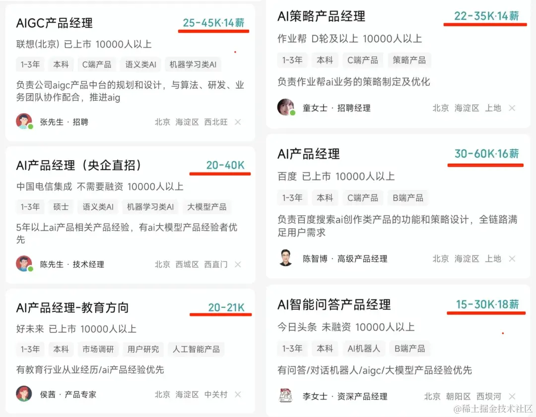 国内也一样,不说大佬,上招聘网站随便一搜,1-3年经验的AI产品经理月薪就能2万起步了,高一点的快接近年薪百万了。对比其他行业,那真是羡慕嫉妒恨啊!