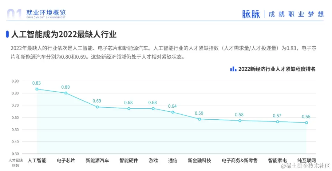 据《脉脉:2023人才迁徙报告》显示,人工智能成为2022最缺人行业。⼈⼯智能⾏业的⼈才紧缺指数(⼈才需求量/⼈才投递量)为0.83,目前该领域仍处于⼈才相对紧缺状态。