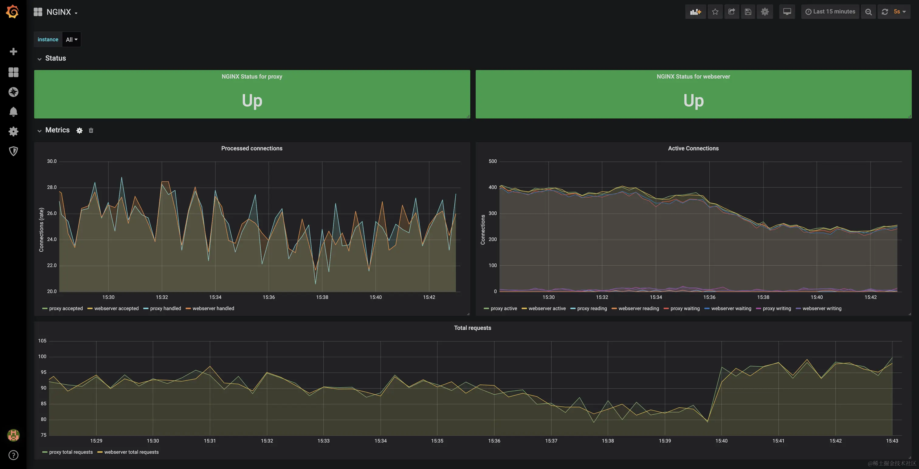 这样就可以将 nginx status 的数据定期采集到 Prometheus 中了,最后使用社区提供的 grafana 面板便可以可视化的查看这些监控数据: