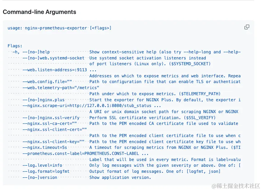 这个其实很好解决,我们直接看看需要实现的 exporter 中提供了哪些参数,这里以 Nginx 的为例: