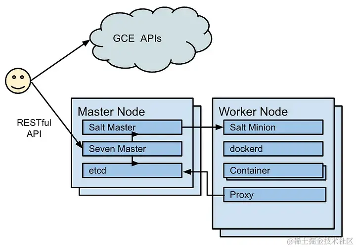 以下是 Ville 设计文档中的图表。请注意,没有 Kubelet,Kube-proxy 直接从 Etcd 读取。在我们发布 Kubernetes 之前,添加了一个最小的 Kubelet。Kubelet 也直接从 Etcd 读取,并且 apiserver 同步调用 Kubelet 以检索任务状态。