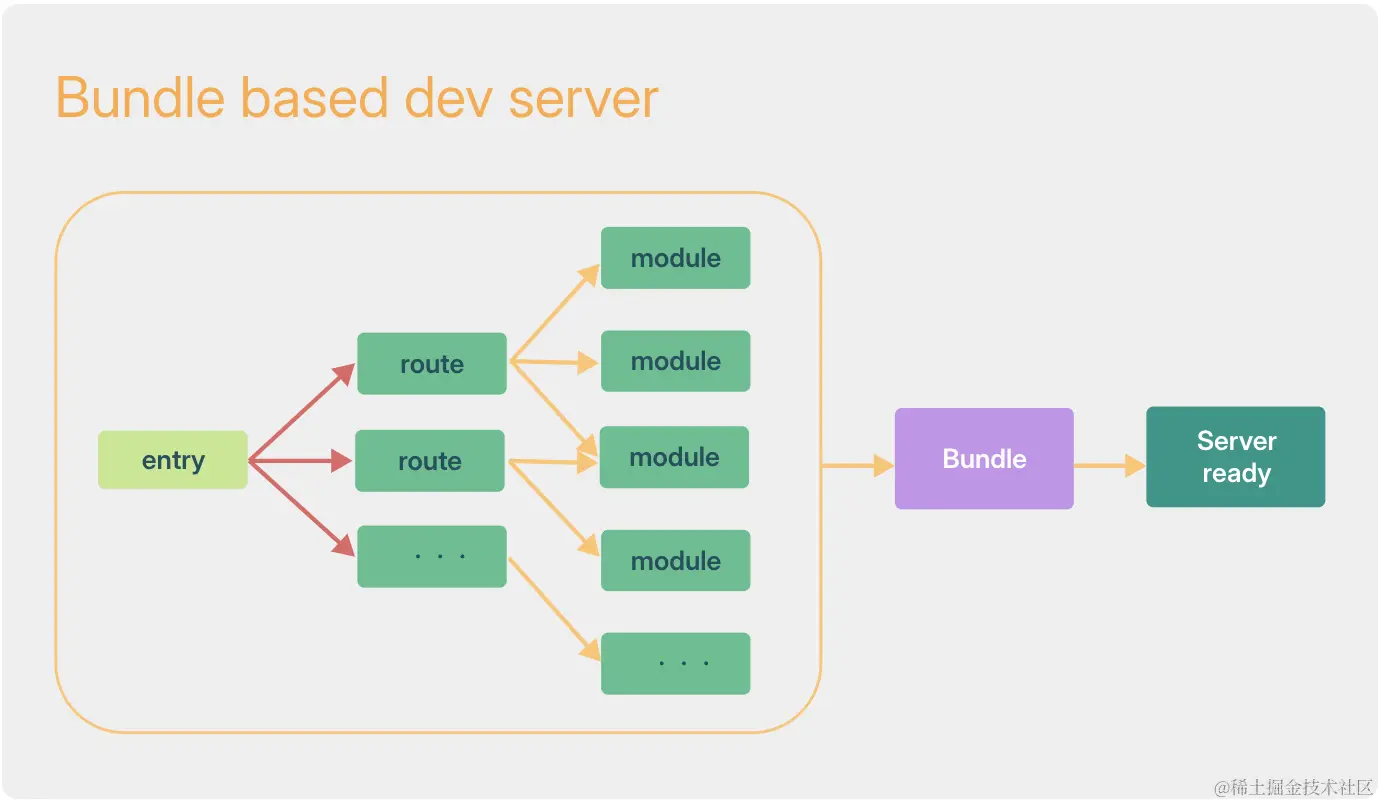 这张图代表的是基于打包器的构建方式(webpack就是其中之一),它在启动服务之前,需要从入口开始扫描整个项目的依赖关系,然后基于依赖关系构建整个应用生成bundle,最后才会启动开发服务器。 这就是这类构建方式为什么慢的原因,并且整个构建时间会随着项目的变大变的越来越长!
