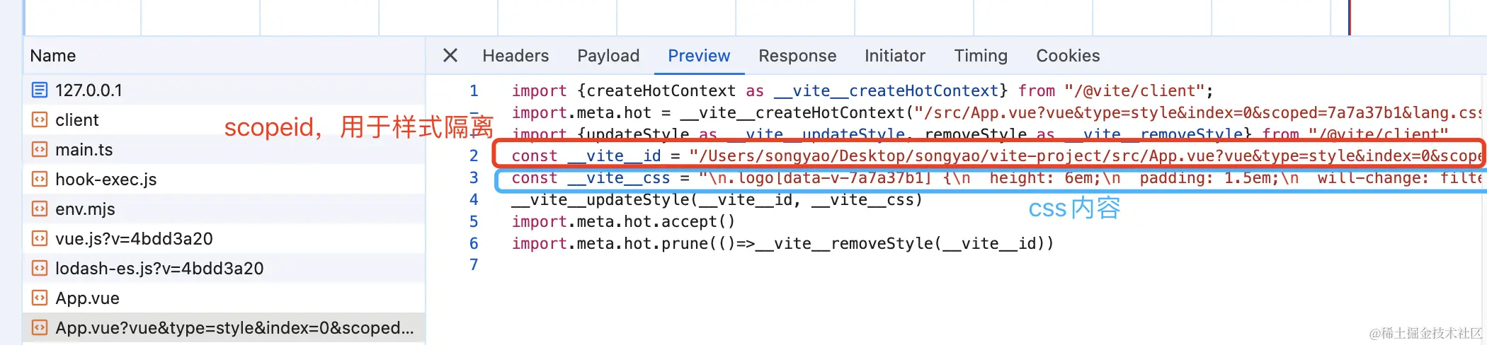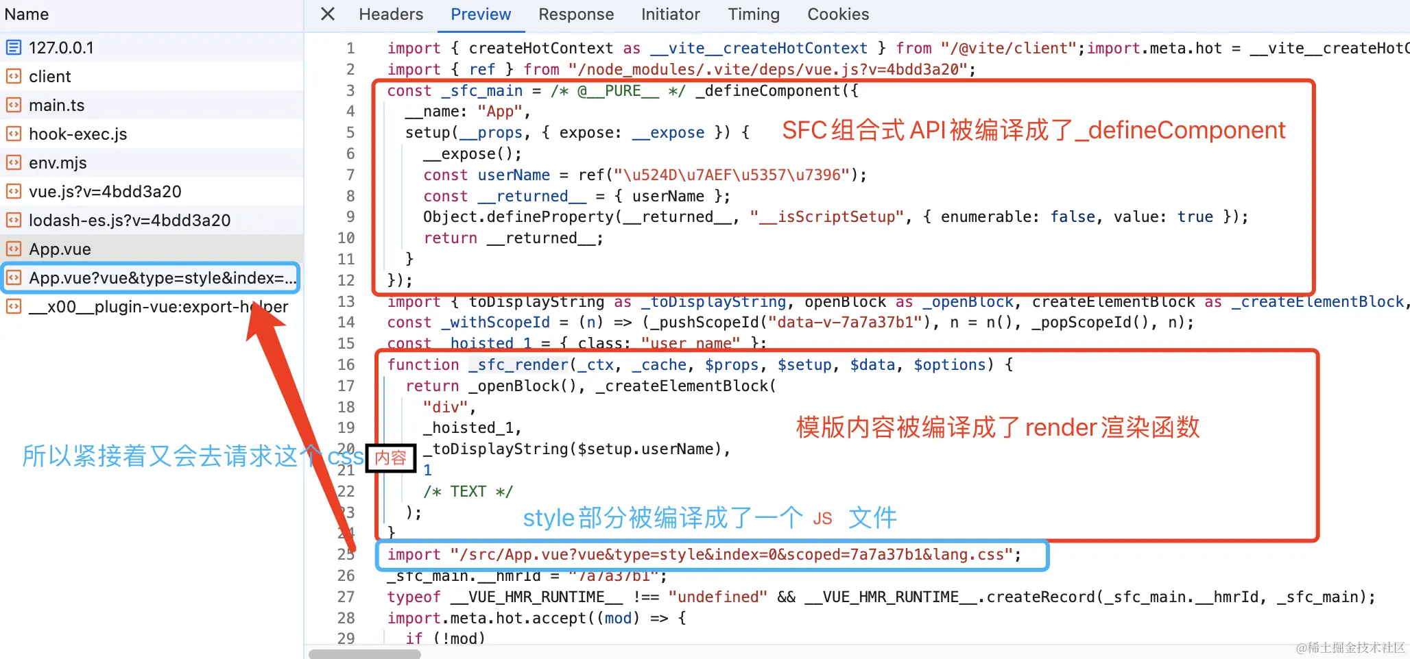 整个文件的加载顺序是不是都对上了,注意看这个App.vue文件,虽然是.vue结尾,但文件类型依然是一个JavaScript文件
