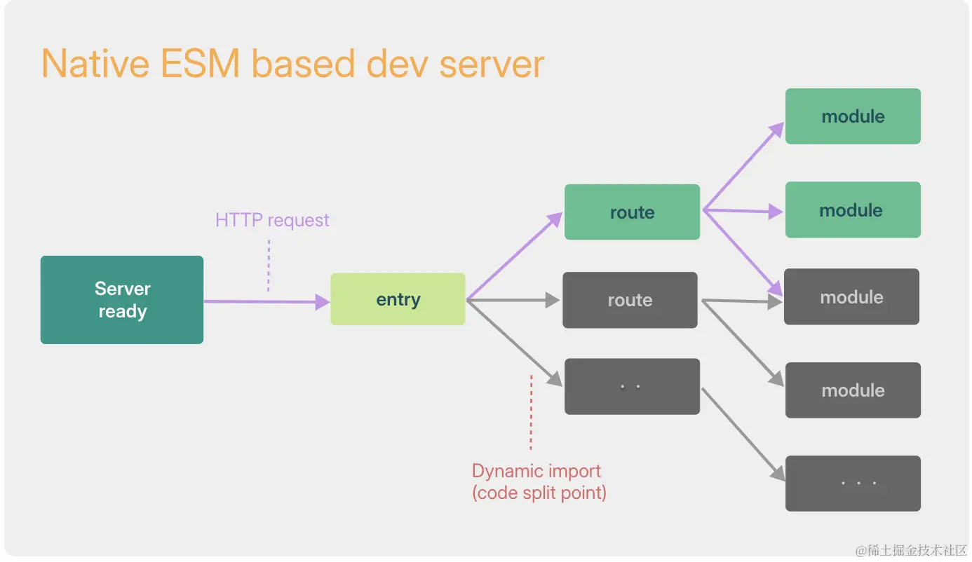 其实上面已经能够说明vite为什么会比webpack快了,但还有另外一个点在上图中并没有表现出来。