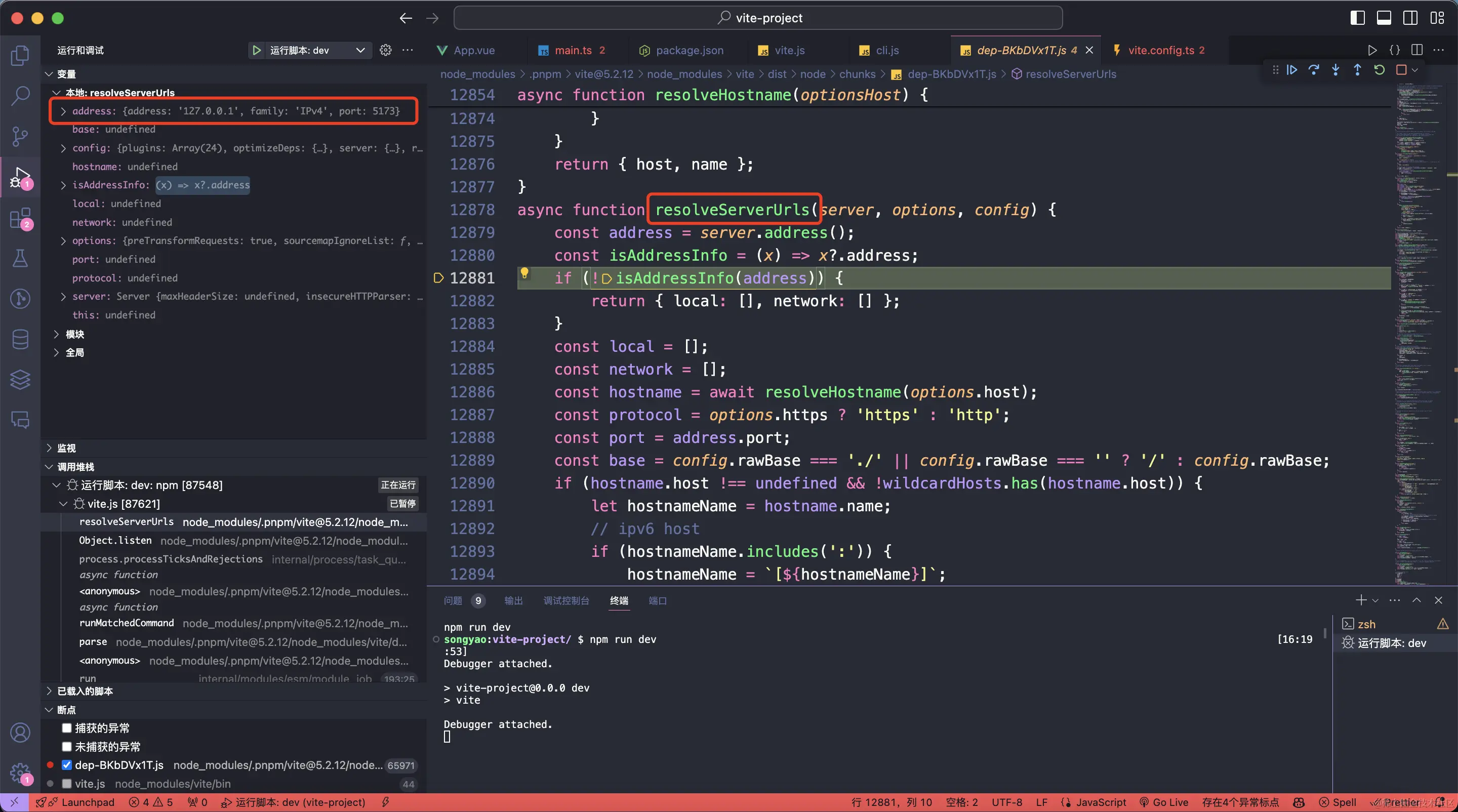 接着往下走,我们可以看到有一个处理url的方法,此时运行栈里面的address变量也能够看到是127.0.0.1:5173,这就是我们等会要访问的本地服务,当然现在浏览器还什么也看不到,因为还没开始处理/路由,该路由需要返回一个html文件,也就是我们的模版文件(项目基于Vue3)
