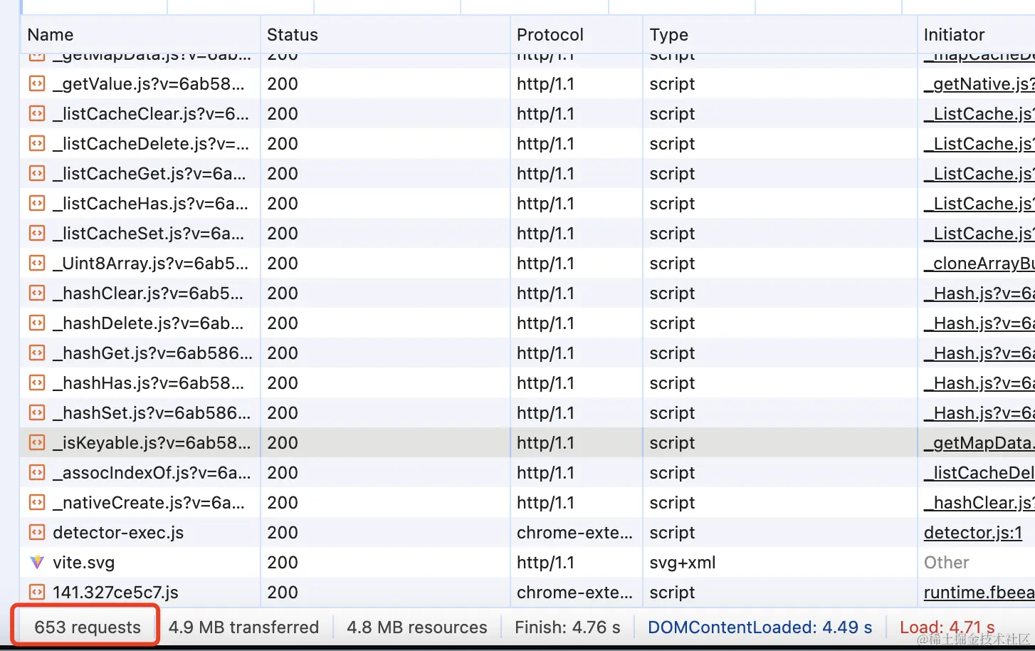 可以看到,此时发起了600多个请求,这是因为lodash-es 有超过 600 个内置模块!
