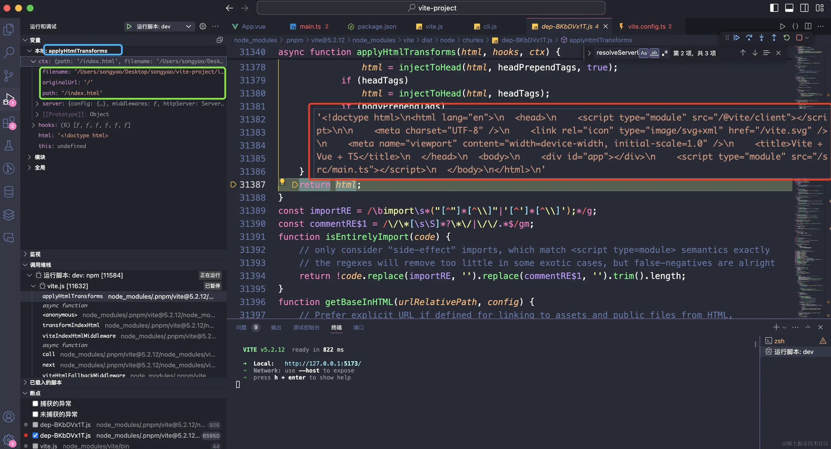 继续往下走,就可以看到有一个applyHtmlTransforms方法用来处理html文件并返回,可以看到当前请求的原始路径是/,返回的文件是项目根目录下的index.html文件