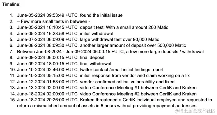 CertiK 表示,通过测试,其发现了 Kraken 的三个主要问题,且在为期数日的测试期间,均未触发任何 Kraken 警报。CertiK 表示,其在正式报告漏洞后,Kraken 几日才做出回应。而且,在漏洞修复后,Kraken 安全运营团队还威胁 CertiK 个别员工在不合理的时间内偿还不匹配数量的加密货币,甚至连偿还地址都未提供。
