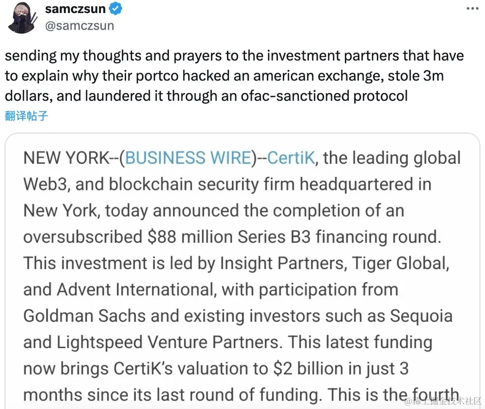另外,作为行业内公认的顶级白帽黑客,Paradigm 研究合伙人 Samczsun 转发了 Certik 此前的融资新闻(2022 年 4 月,CertiK 完成 8800 万美元融资,Insight Partners、Tiger Global 和 Advent International 领投,参投方包括高盛、 红杉和 Lightspeed Venture 等)调侃道,「我向那些必须解释为什么其投资的公司黑进了一家美国交易所,盗取了 300 万美元,并通过 OFAC 封杀的协议进行洗钱的投资合伙人致以哀思和祈祷。」