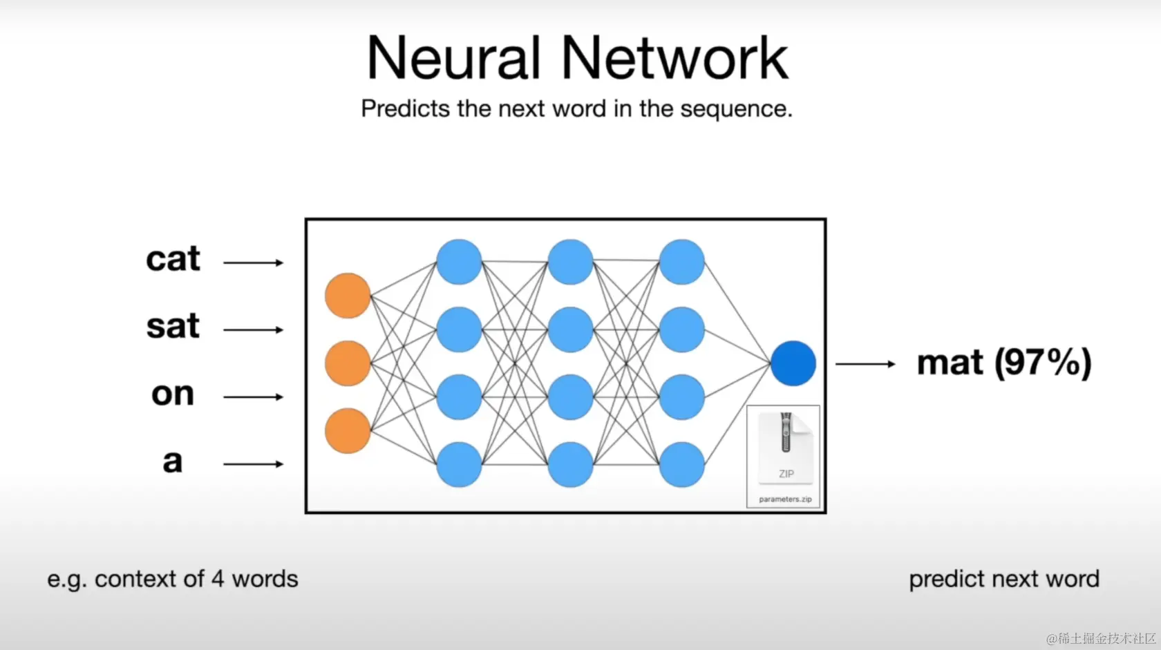 •利用分布在网络中的参数及其连接关系预测下一个最可能的单词,并给出概率。如“mat(97%)”